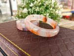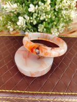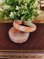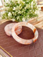 Adorn your wrist with the subtle charm of our Cherry Blossom Agate Bangle.** This captivating piece showcases the unique beauty of cherry blossom agate, a gemstone celebrated for its soft, milky white base interlaced with delicate inclusions of peach, orange, and sometimes deeper brown hues, reminiscent of blooming cherry blossoms against a serene sky.
